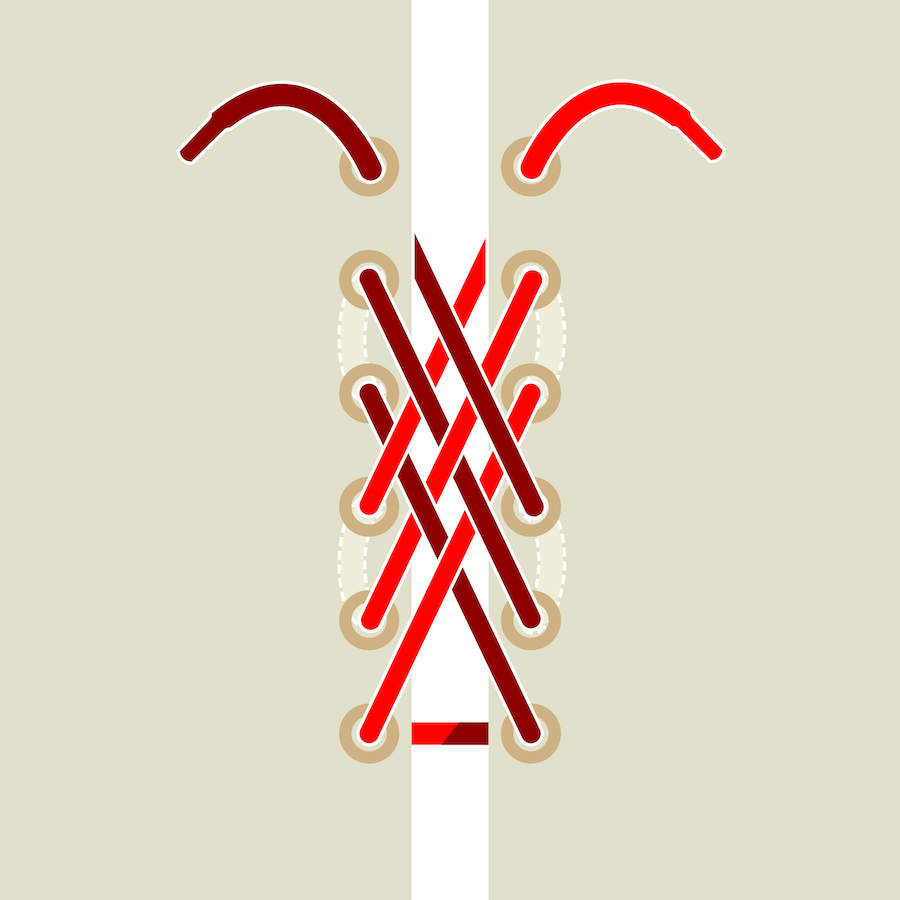 Trong trường hợp bạn có thêm một bộ khoen, bạn có thể chọn bỏ qua cặp ở giữa và luồn dây giày qua bộ khoen từ bốn hàng lên xuống thay vì ba hàng.