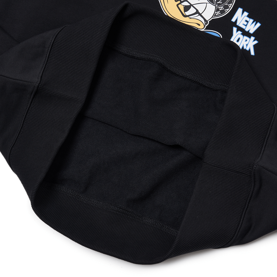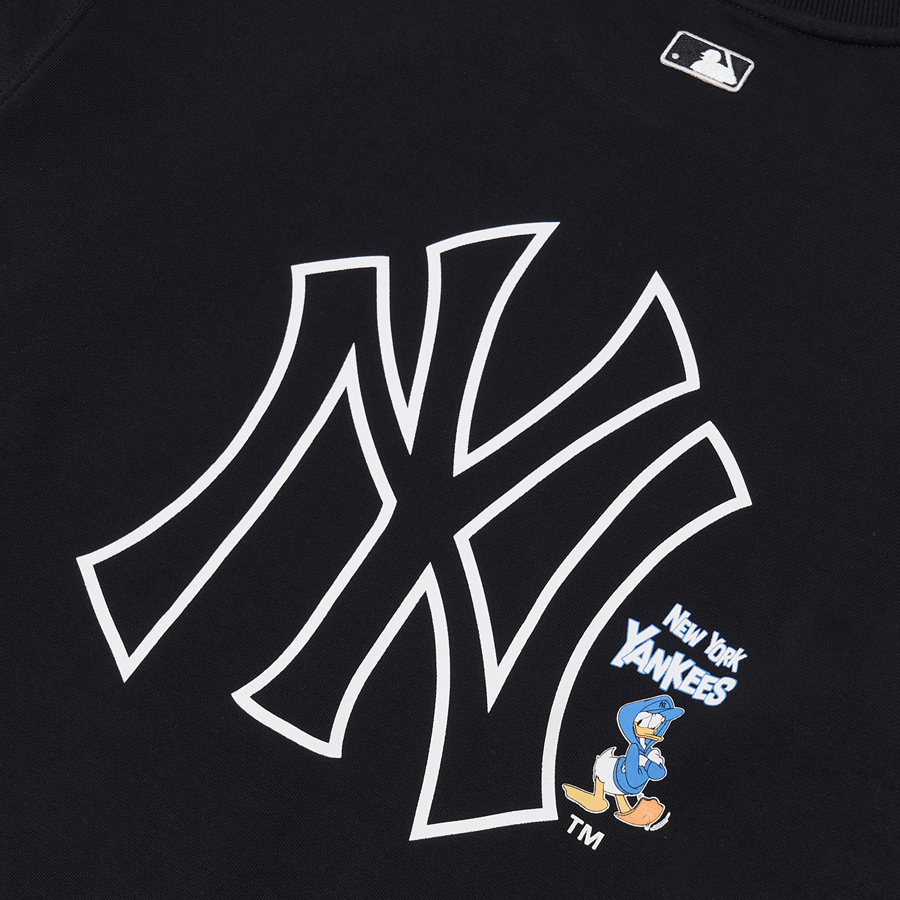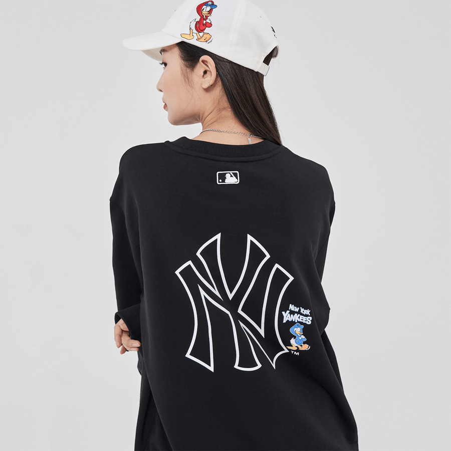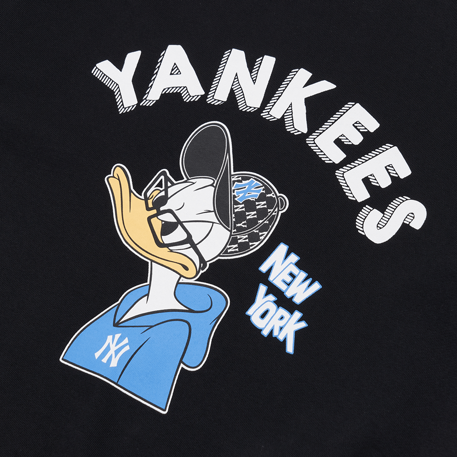 Mặt sau áo đồng điệu với mặt trước bằng kí tự NY có kích thước khá to, đây là kí hiệu logo của đội bóng chày New York Yankees không còn xa lạ, đường nét cá tính và mạnh mẽ phần nào thể hiện được những đặc trưng của phong cách thời trang giới trẻ. Kèm theo đó là chú vịt Donald trông khá tự tin, nhí nhảnh và sự lặp lại của dòng chữ New York Yankees thêm đặc biệt. Ngoài ra, phía sau cổ áo luôn là hình ảnh biểu tượng bộ môn bóng chày rõ nét với màu trắng nên nền đen áo ấn tượng
